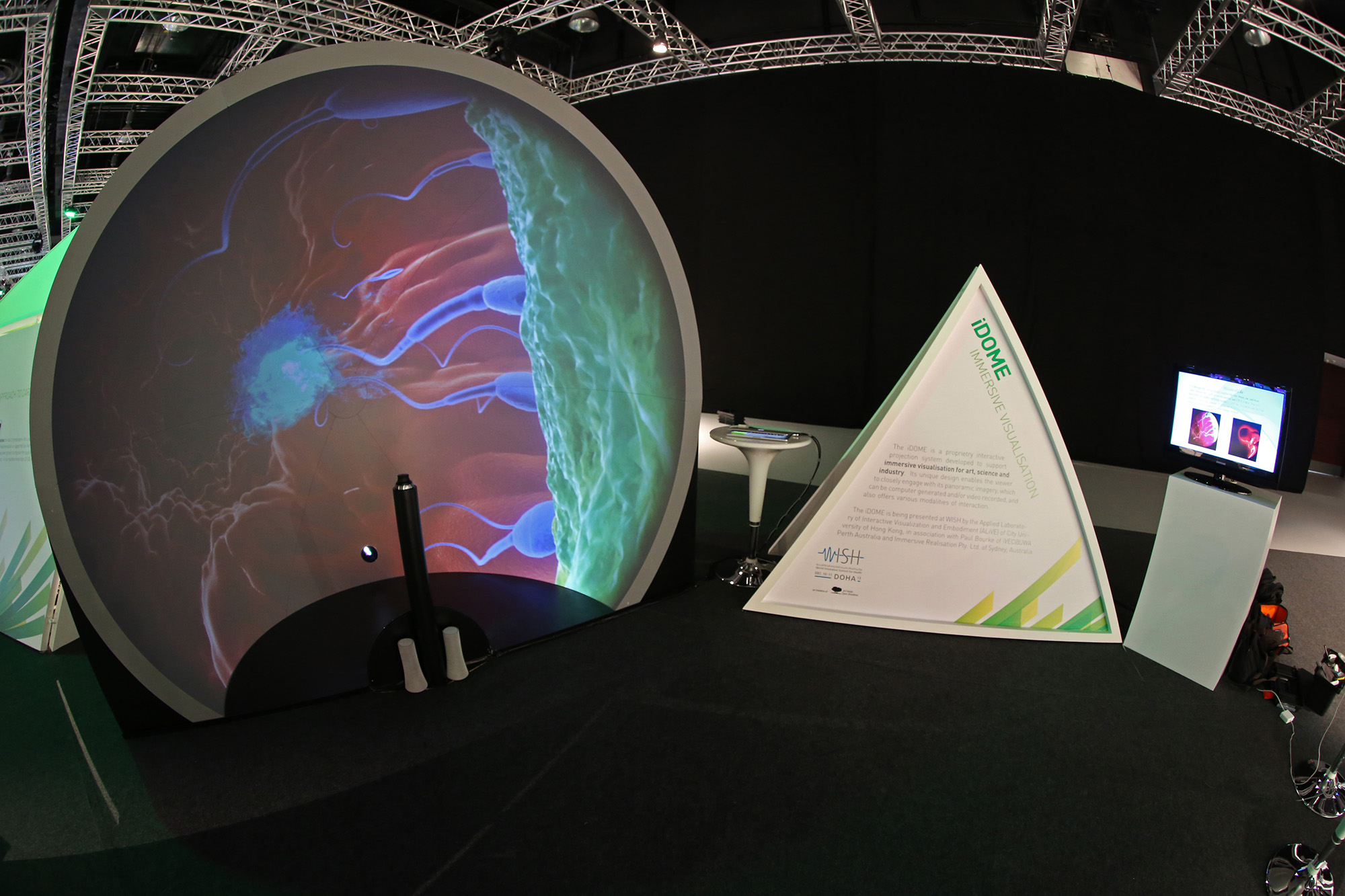Just spent a week in Doha at the World Innovation Summit for Health. Besides being an amazing event I was commissioned to set up an iDome in the innovation hall. While I put together some content based upon medicine and biology, the main content was to demonstrate immersive remote surgery. One of the main organisers of the event (1000 delegates, invitation only) is the Imperial College of London where they have invented a surgical tool called the iKnife. In short it is an electric knife (i = intelligent) for surgery that extracts the smoke from the cut tissue and runs it through a mass spectrometer and tells the surgeon what type of tissue he/she is cutting through (healthy, cancerous for example). In short we demonstrated this at the conference, on a pretend patient of course … a selection of cow internal organs.