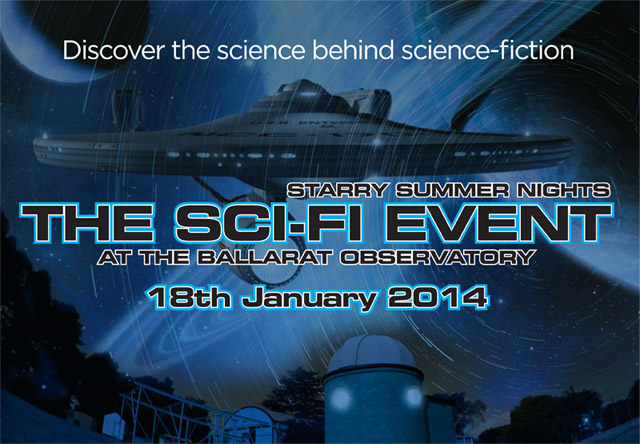 We have continued with our Starry Nights events and for the first time ever in Ballarat we have themed our Summer Starry Night – The Sci-Fi Event. Unlike a comic convention, this event is about promoting and educating the public about the relationship between science, science-ficiton and their role in society, with the emphasis being on science.