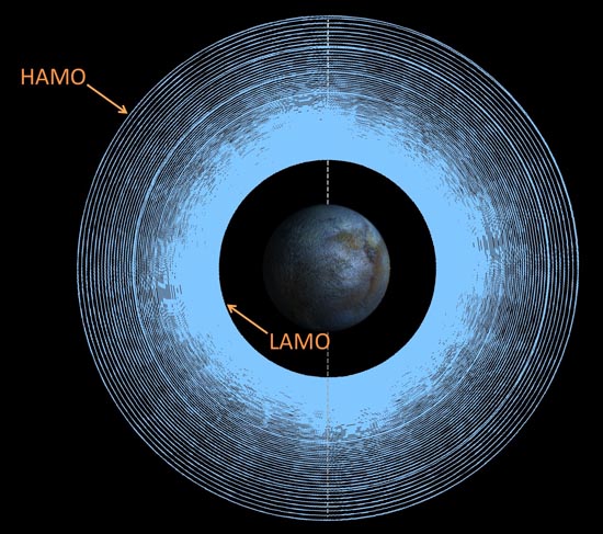 Two months of downward spirals are needed to move Dawn into its lowest orbit – from the High Altitude Mapping Orbit (HAMO) to the Low Altitude Mapping Orbit (LAMO). Credit: NASA/JPL