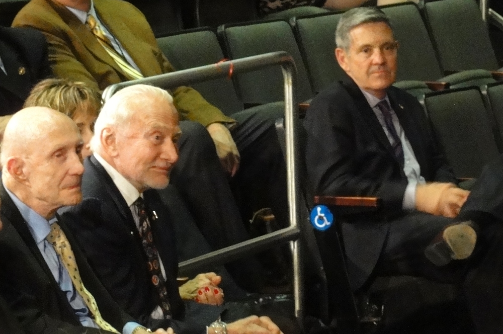Below – Apollo 10 Commander Tom Stafford, Apollo 11’s now-bearded Buzz Aldrin and KSC Director Bob Cabana.