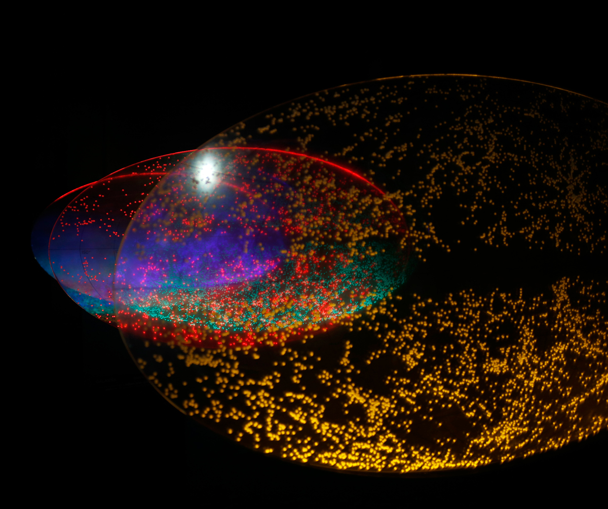 The installation uses real all-sky redshift data to plot the position of galaxies in galactic coordinates (essentially, the Milky Way becomes the coordinate reference frame). Each panel represents the a certain stage in the evolution of the Universe (or galaxies at a particular redshift). The brightness of the panels can be controlled by the viewer, and the color of the panels changes to red, representing the fact that the light (spectrum) from the most distant objects is shifted towards the red end of the Electromagnetic Spectrum.