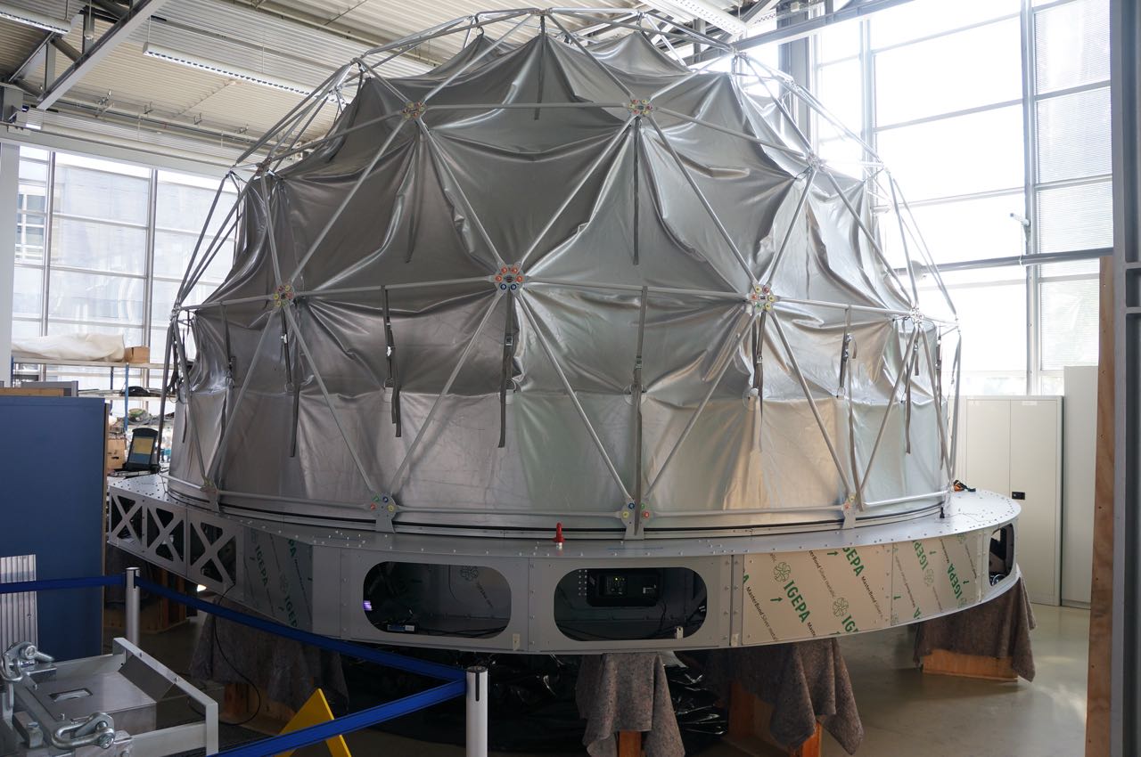 Here is a sneak preview of our new touring dome in the assembly/test area in Germany and currently in boxes on its way to UNSW, Sydney. Just sitting on boxes in this photo, but eventually it sits on legs raising the rim to just above head height giving unconstrained walk-in and out. The legs also allow up to a 20 degree tilt.