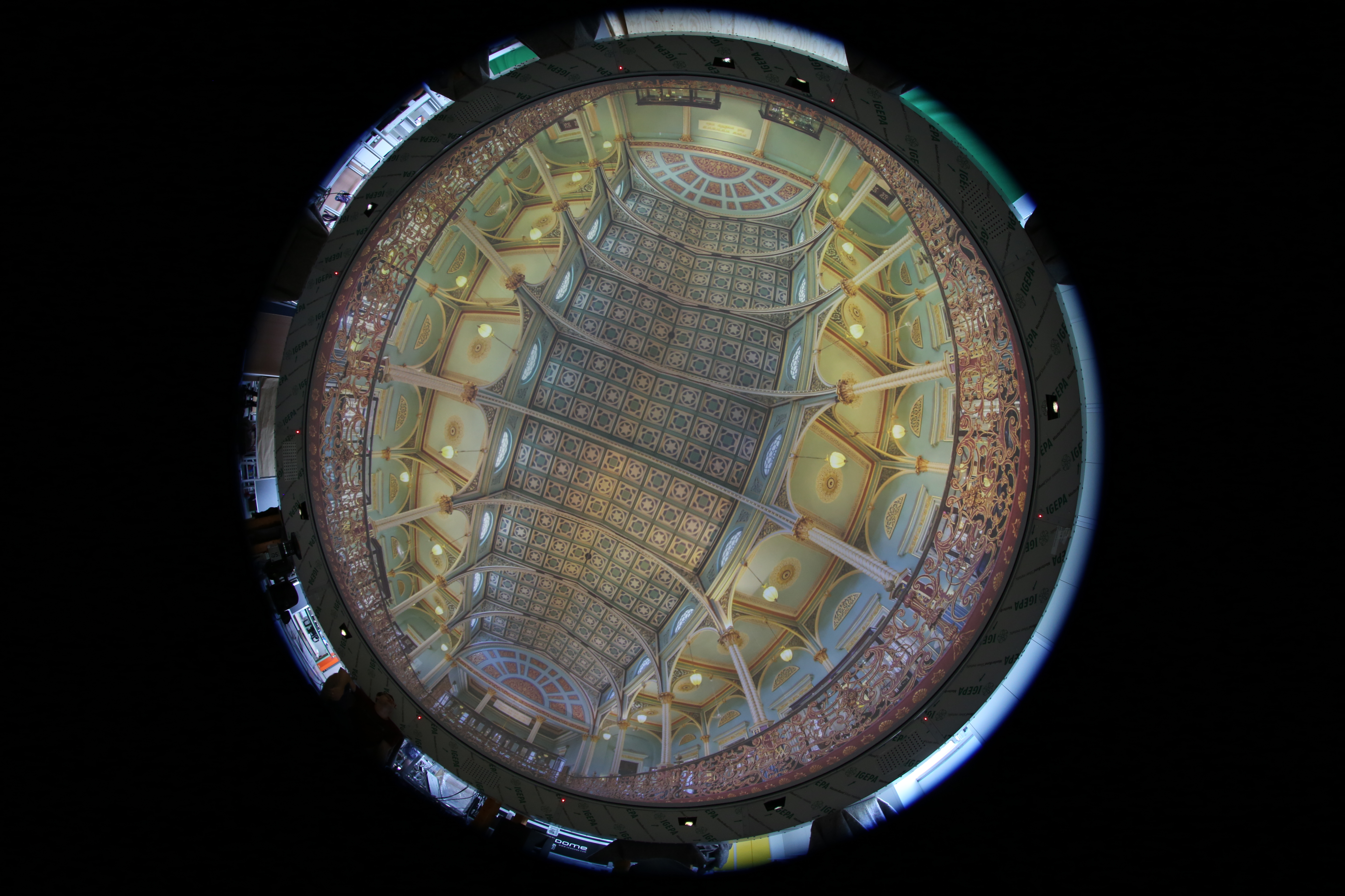 Some specifications: the dome is just 6m diameter, negative pressure inner surface, display consists of eight 2560×1600 pixel projectors, driven from a cluster of 4 computers. This means it is the highest resolution dome in Australia, unlike other so called “4K” systems this one actually has 12,000 pixels around the rim. Would be interested in hearing if anyone knows of higher resolution touring domes internationally.