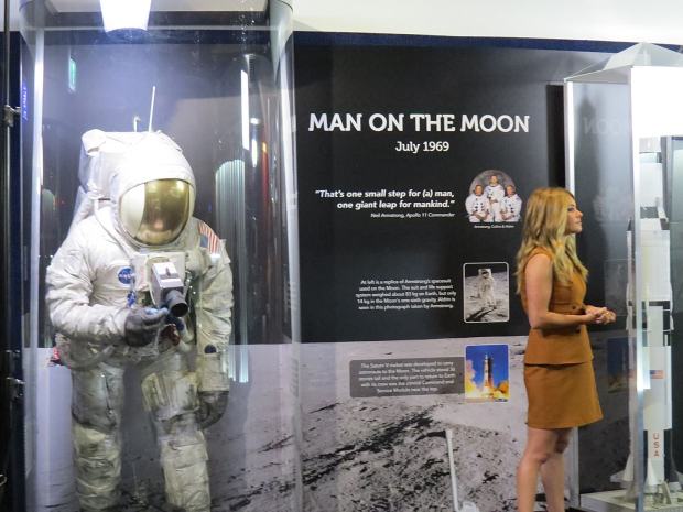We couldn’t do a cross from outside because of the weather, so we did the first cross from next to one of the Apollo exhibits featuring the replica of Neil Armstrong’s lunar spacesuit and the 1/48th scale Saturn V.
