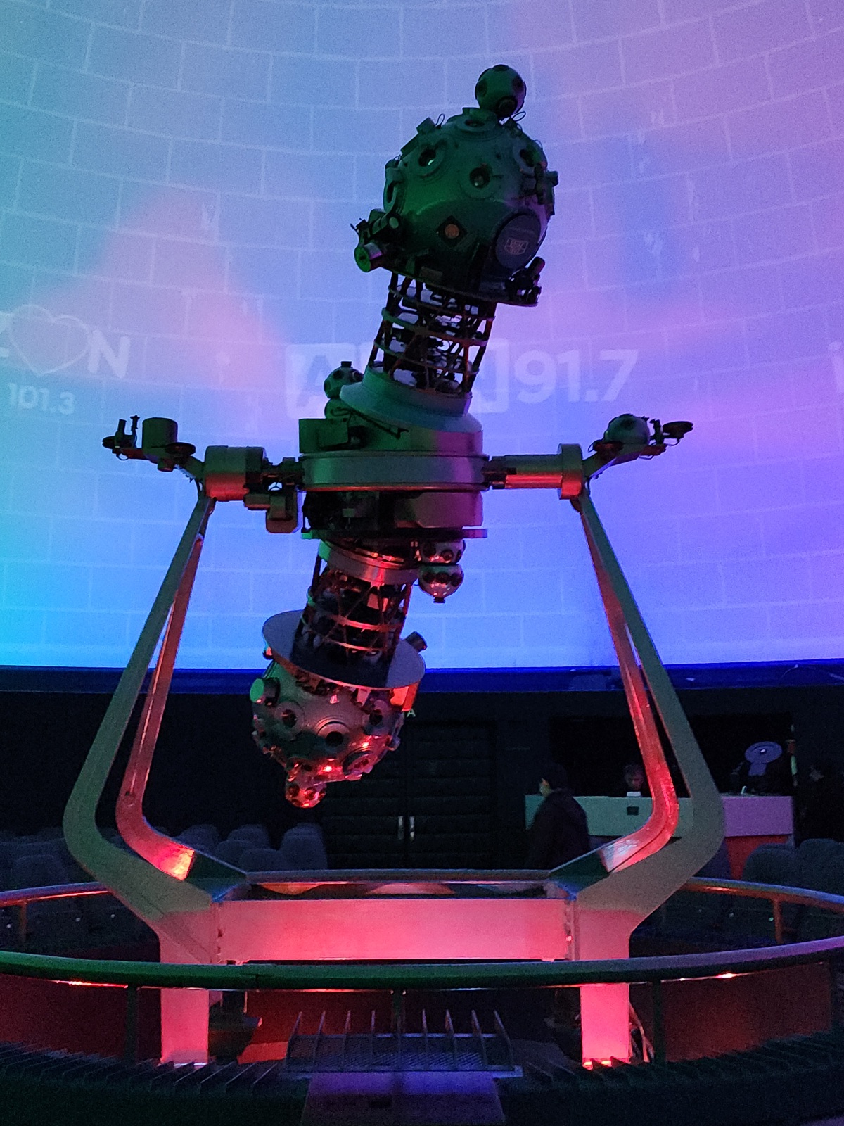 The University of Santiago’s planetarium opened in 1985 with a 20-metre dome and a Zeiss VI projector, which is still in use and was put through its paces, including being raised and lowered from three floors below the theatre. The digital system is a Zeiss Power Dome and there are eight Zeiss VELVET projectors. Seating is provided for 289.