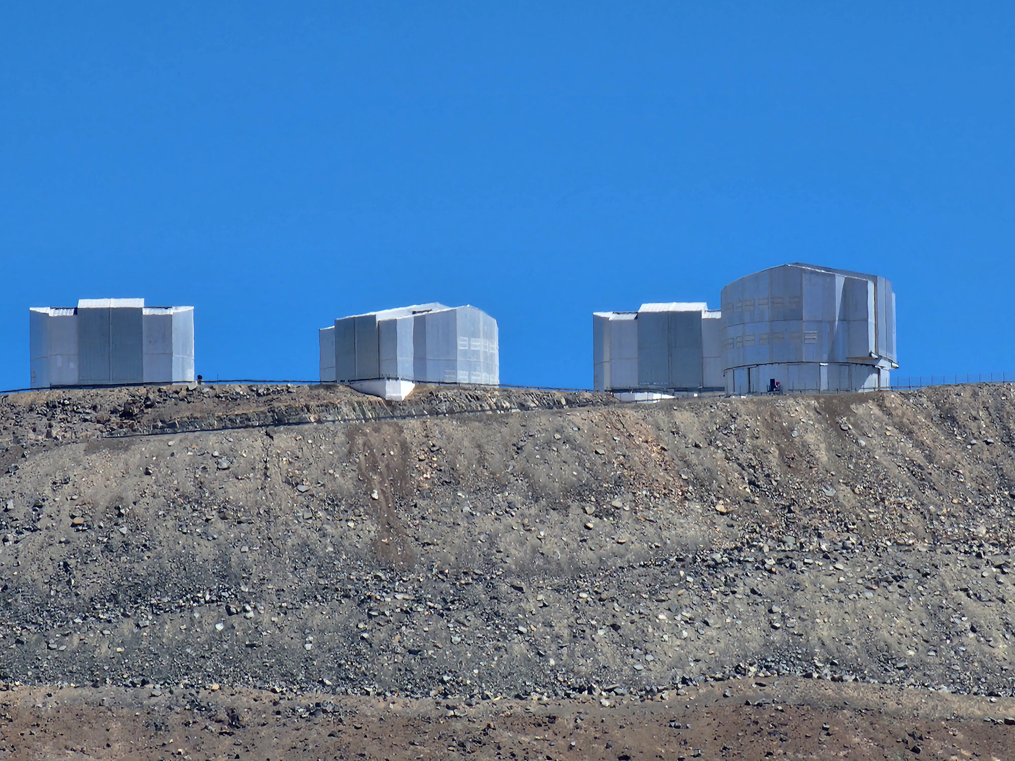 Further north in Chile’s Atacama Desert and at an altitude of 2,635m is Paranal Observatory, which is one of the best observing sites in the world. Various facilities are operated by the European Southern Observatory, including the Very Large Telescope (VLT) with its four main independent Unit Telescopes and adjacent smaller ones. Below the VLT are support facilities and also the La Residencia for visiting astronomers and staff.
